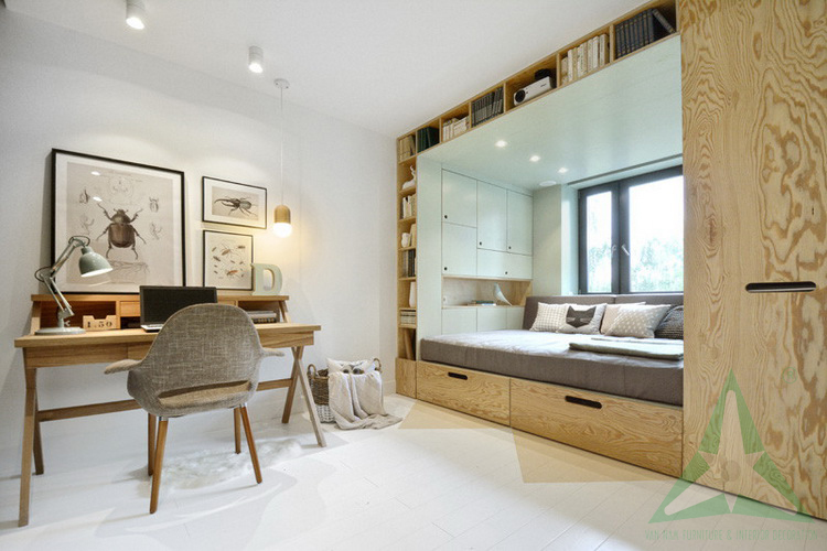 In a small bedroom, it will become smaller and cramped, messier with the spread layout. If you want to get the best out of space to ensure all functions such as work place, storage area, resting, etc… it should be designed in accordance with vertical. It’s necessary to use multi-purpose furniture including lockers, book storage shelves at the bottom as well as beds and desks at the top.