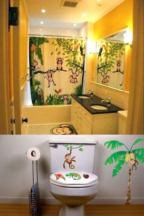This monkey themed bathroom really looks adorable with its colorful wallpaper style. You can decorate every corner of the bathroom with monkey images. But, make sure you combine several accents in the bathroom. |