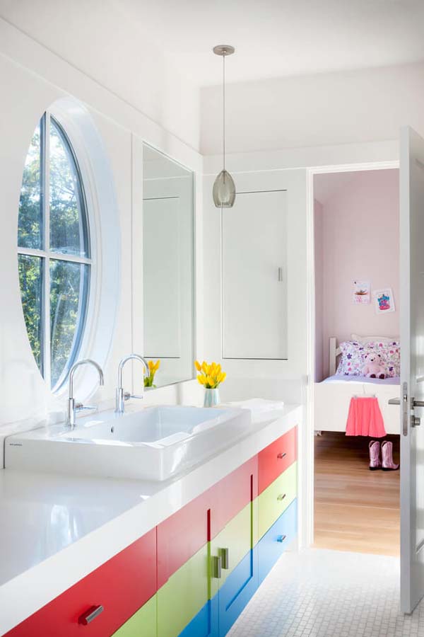 Instead of animal images or cartoon characters, kids also love colorful things. The colorful theme looks more great and modern. Don't be afraid to use the bright colors to decorate your kid's bathroom.
