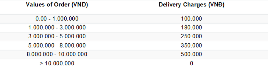 We use service from the 3rd party; therefore, our delivery charges are intended to cover the processing of your order, handling and packing the products, and finally delivering them to you. For orders above 10 Million VND, delivery will be free.
