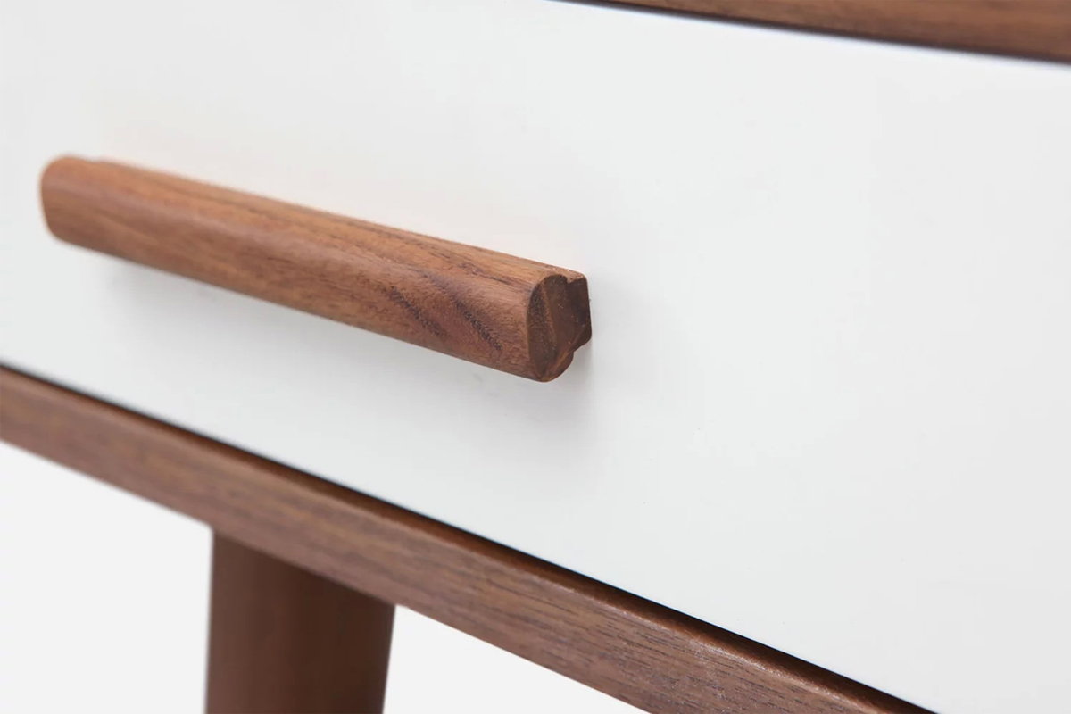 Tay cầm bằng gỗ đặc biệt trên nền mặt ngăn kéo sơn mài trắng tinh xảo.